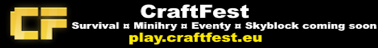 CraftFest je server založený v Listopadu roku 2023 a hlavním cílem serveru je nabízet rozsáhlou škálu her pod jednou střechou. Tvoříme komplexní systém, zkrátka aby si zde každý našel to svoje. Usilujeme o maximální propracovanost her a rozrůstání serveru, najdeš u nás také coin systém (za výhry a účast) díky kterému si můžeš kupovat různé perky v minihrách, systém VIP, kosmetik a levelů. Nicméně je to finančně i časově náročná činnost, do které náš team dává všechno své usilí, proto jsme rádi za jakoukoliv podporu serveru.